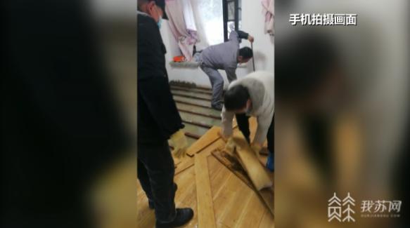 邵先生家的卧室木地板下面铺了几公分高的一层龙骨,撬开木地板后,下面全是污水,看来管道破裂已经有一段时间。接到投诉,物业工作人员来到邵先生家清理污水、维修管道。“一直搞到下午五点多钟,还是没有搞完。”邵先生说,剩余的污水流到了隔壁的房间。